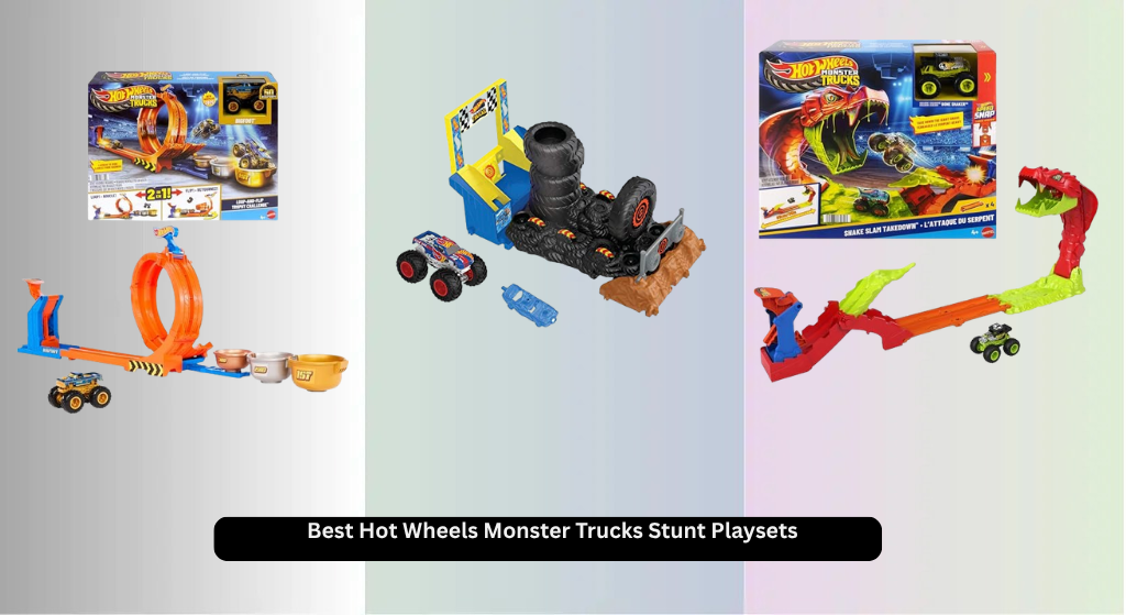 | Hot Wheels Monster Trucks Stunt Tire Playset | Best Overall | 3 Monster Trucks & 3 Hot Wheels | Slam launcher, ramp, “ring of fire”, flip stunt | Handle for portability | Connects to other sets | Not specified |